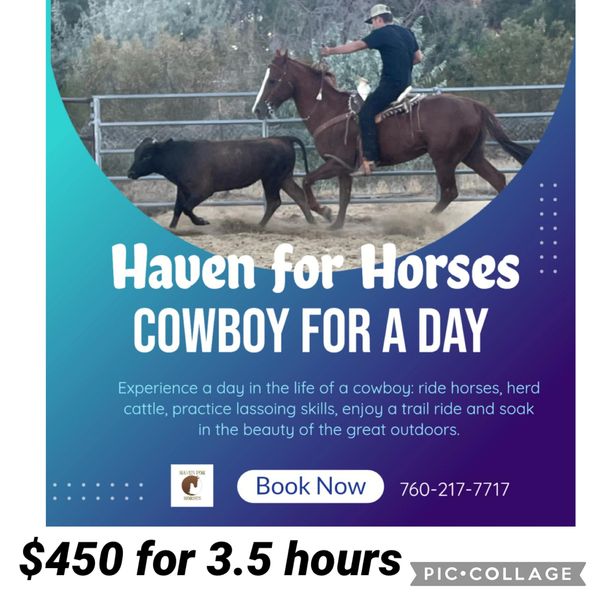 Ready for an authentic adventure? Experience the thrill of being a cowboy for a day! Saddle up, ride across scenic trails, learn to lasso, rope and work a steer and enjoy a true Western experience. No prior experience needed—just bring your sense of adventure! Book now and live the cowboy life, even if just for a day!